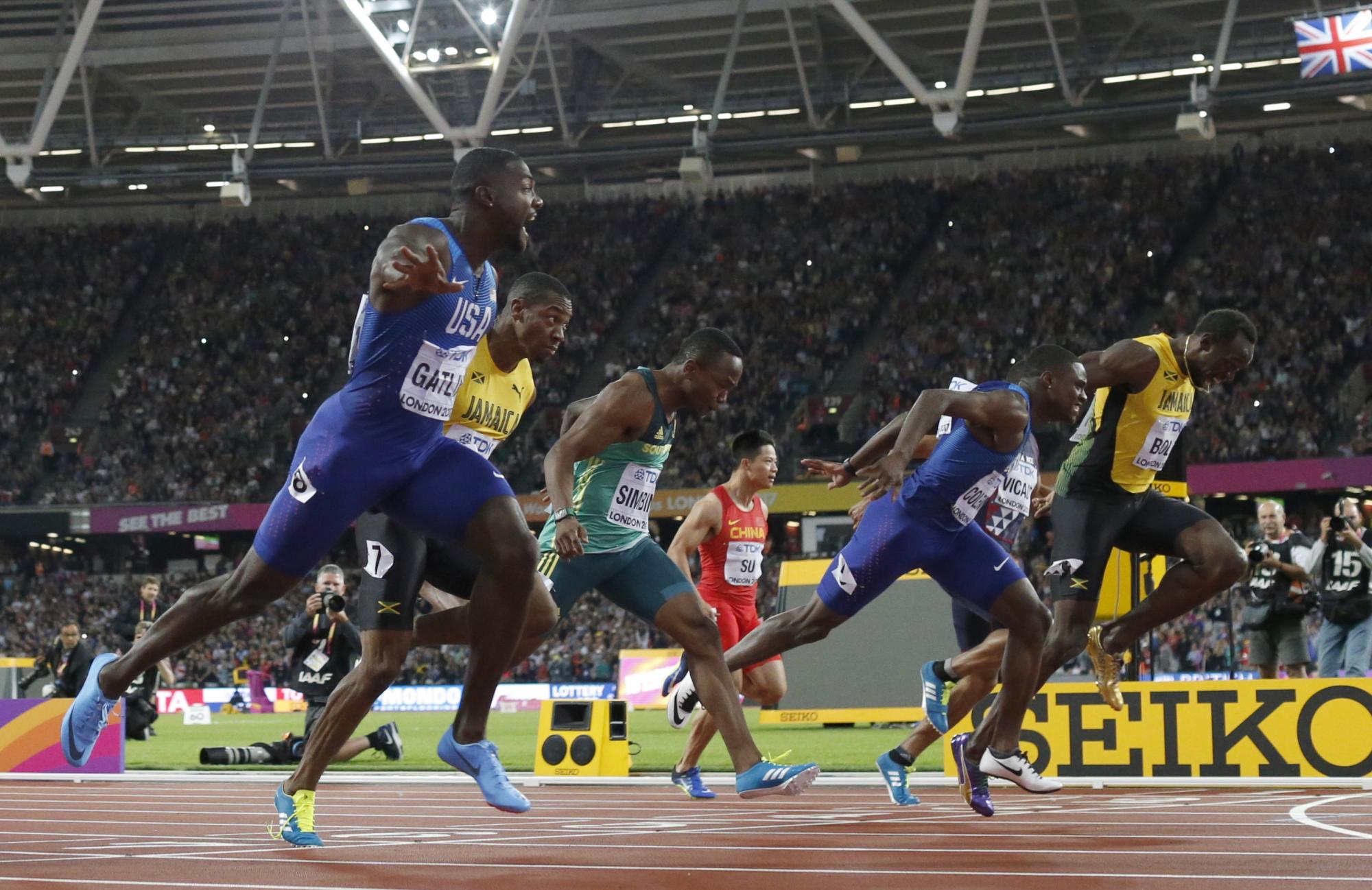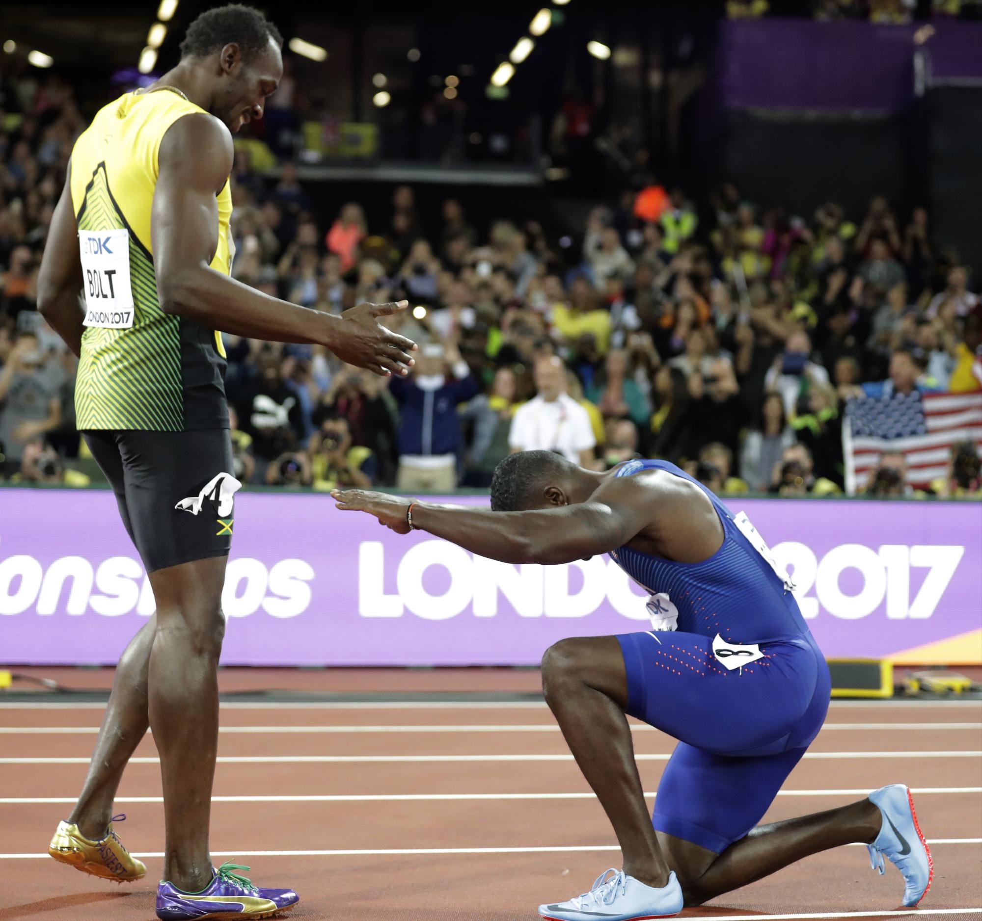 Bolt, de 30 años, terminó tercero con una marca de 9s95/100 en su última prueba de 100 de su carrrera, mientras que Gatlin, subcampeón mundial en Beijing 2015, Moscú 2015 y en los Juegos Olímpicos de Río de Janeiro 2016, ganó con un tiempo de 9s92/100 y segundo quedó su compatriota Christian Coleman (9s94/100).