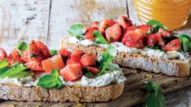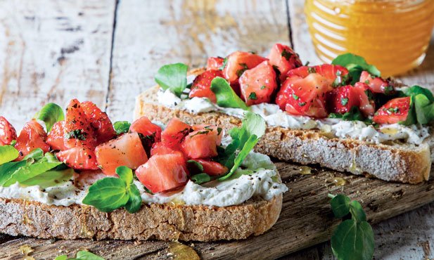 Dorar la rodaja de pan con un toque de oliva. Una vez lista, untarla con el queso, acomodar los pimientos cortados en tiras previamente cocidos, las almendras, y condimentar.