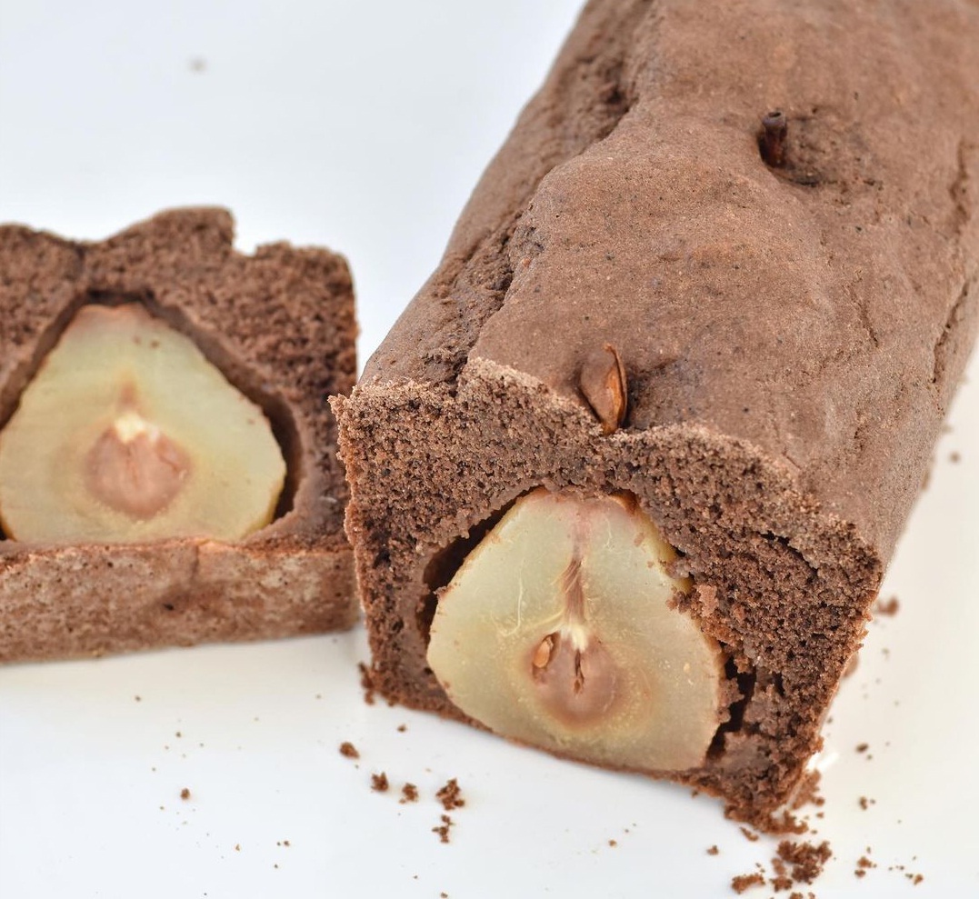 En un bol mezclamos los secos: la harina integral, el edulcorante, el cacao, la sal y el polvo de hornear. Agregamos los huevos, la manteca, la esencia y la leche de a poco. Formamos una crema suave. Una vez lista, enmantecamos y enharinamos una budinera (la mía es grande, de 12 x 27 cm) y ponemos un poco de la mezcla para luego acomodar las peras (podemos cortar un poco la base de la pera para que se mantenga en el lugar). Ponemos las peras y sumamos el resto de la preparación por encima. Llevamos 1 hora al horno precalentado a 180º C o hasta que pinchando con un palillo este salga limpio.