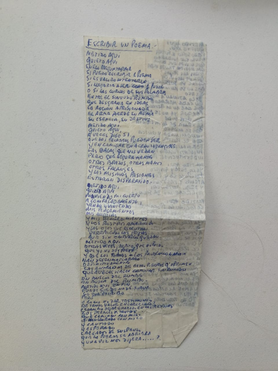 En la cárcel escribió poemas en papelitos muy chiquitos, la mitad de chicos que el envoltorio de un alfajor. El objetivo era que pudieran salir, pasar la reja y burlar lo que en ese entonces eran brutales requisas a quienes visitaban los penales, según indican los testimonios directos de sus familiares.