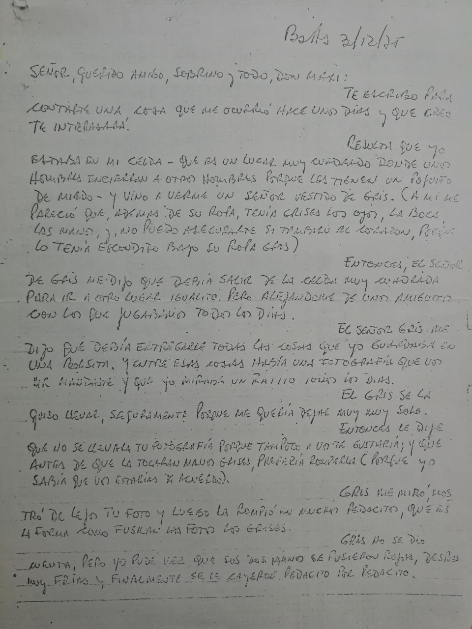 “Señor, querido amigo, sobrino y todo, Don Maxi: Te escribo para contarte una cosa que me ocurrió hace unos días y que creo te interesará. Resulta que yo estaba en mi celda, que es un lugar muy cuadrado donde unos hombres encierran a otros hombres porque les tienen un poquito de miedo, y vino a verme un señor vestido de gris (a mi me pareció que además de su ropa, tenia grises los ojos, la boca, las manos y no puedo asegurarme si también el corazón, porque lo tenía escondido bajo su ropa gris). Entonces, el señor de gris me dijo que debía salir de la celda muy cuadrada para ir a otro lugar igualito. Pero alejándome de unos amiguitos con los que jugábamos todos los días. El señor gris me dijo que debía entregarle todas las cosas que yo guardaba en una bolsita. Y entre ellas, había una fotografía que vos me mandaste y que yo miraba un ratito todos los días. El gris se la quiso llevar, seguramente porque me quería dejar muy muy solo. Entonces le dije que no se llevara tu fotografía porque tampoco a vos te gustaría; y que antes de que la tocaran manos grises, prefería romperla, (porque yo sabía que vos estarías de acuerdo).Gris me miró, mostró de lejos tu foto y luego la rompió en muchos pedacitos, que es la forma como fusilan las fotos los grises. Gris no se dio cuenta, pero yo pude ver que sus dos manos se pusieron rojas, después muy frías y finalmente se le cayeron, pedacito por pedacito. Ahora estoy viviendo en otra celda muy cuadrada junto con un amiguito que quizás alguna vez conozcas. Pero te confieso que me siento un poquito solo por este asunto de gris con vos. (¿Le hiciste alguna morisqueta a gris?).