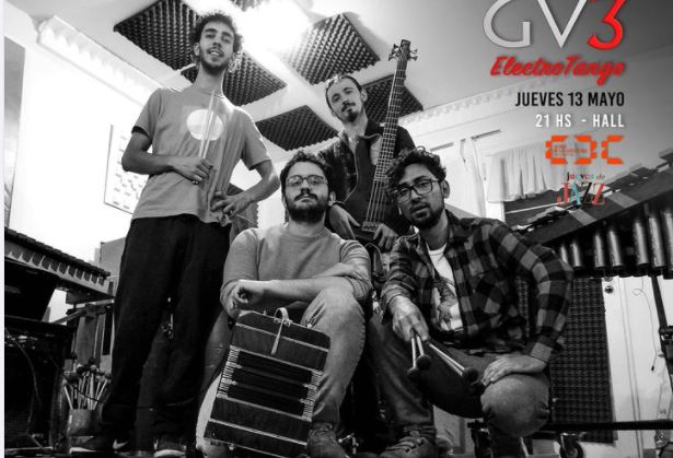 Este jueves el ciclo de jazz nos presenta a “GV3 Electrotango”. Es un trío que experimenta entre el tango principalmente, el jazz, el rock, el folklore y la música electrónica. Sus sonoridades remiten a la guardia vieja del tango de los años 20 yuxtapuesta con los nuevos ritmos y tendencias del S XXI como el neo soul, pop, dubstep y trap. GV3 se caracteriza por la sonoridad del vibráfono como voz cantante innovando en el género electrotango.