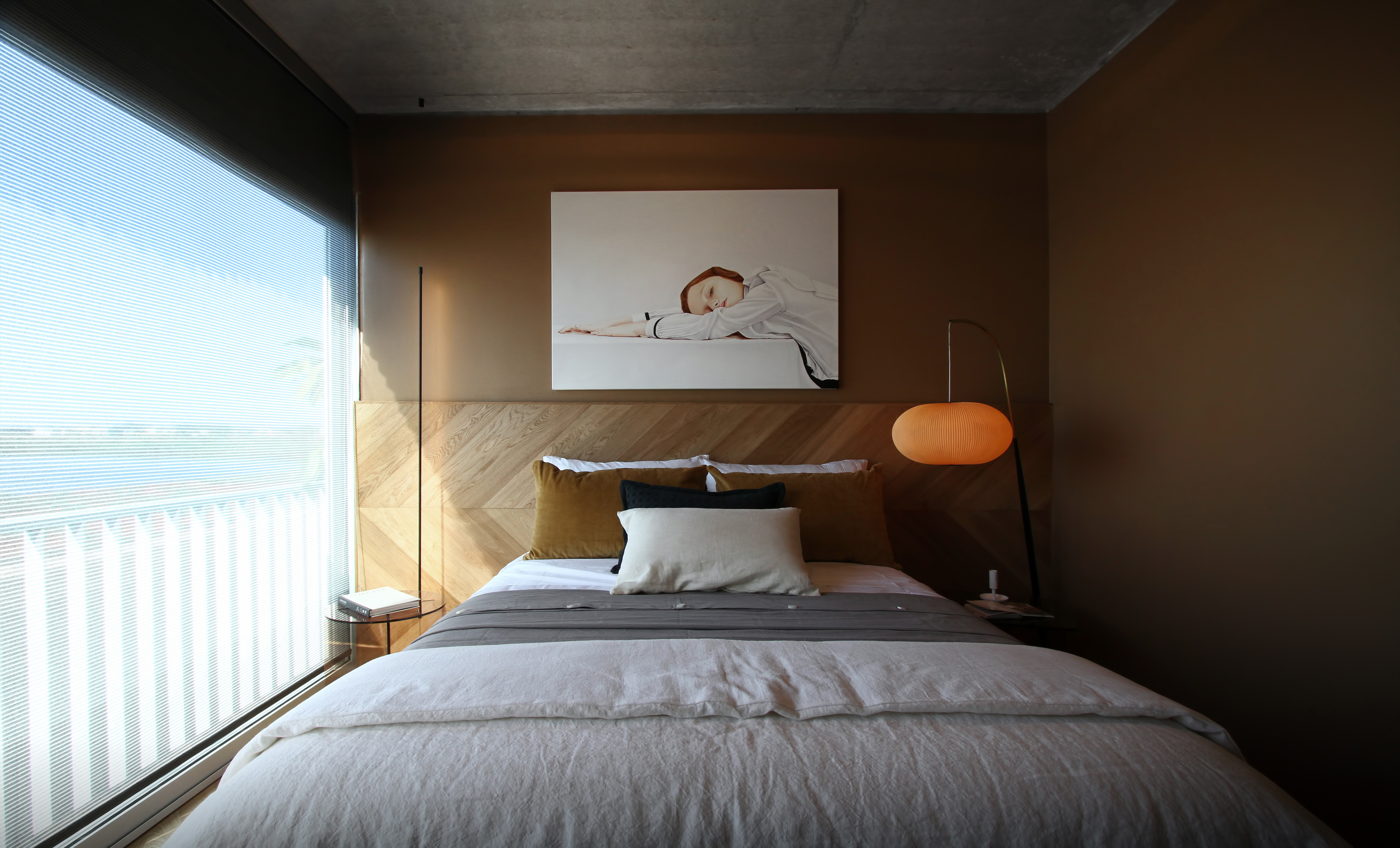 El dormitorio es refugio: es así como se entiende el clima de sosiego logrado por estos profesionales. La continuidad de la madera y la utilización del piso que sube hacia la pared, donde se transforma en respaldo de cama, es un recurso que potencia esta idea de caja calma.