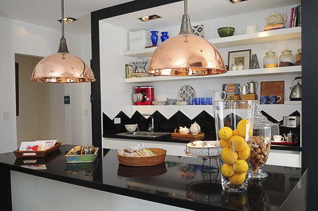 Las dos lámparas de cobre de la cocina, la hamaca de madera maciza y soga, que cuelga del ventanal del living y una gran foto de la luna de Peryra Lucena, todo traido desde la casa de Azzano, terminan de enmarcar el ambiente.