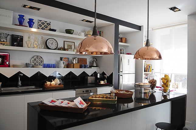 En la cocina, el blanco inmaculado admite una guarda de revestimientos negros, que terminan en punta, inspirados en los Andes, esos que la diseñadora ve dese su finca en San Juan, lugar en el que vive hace años.