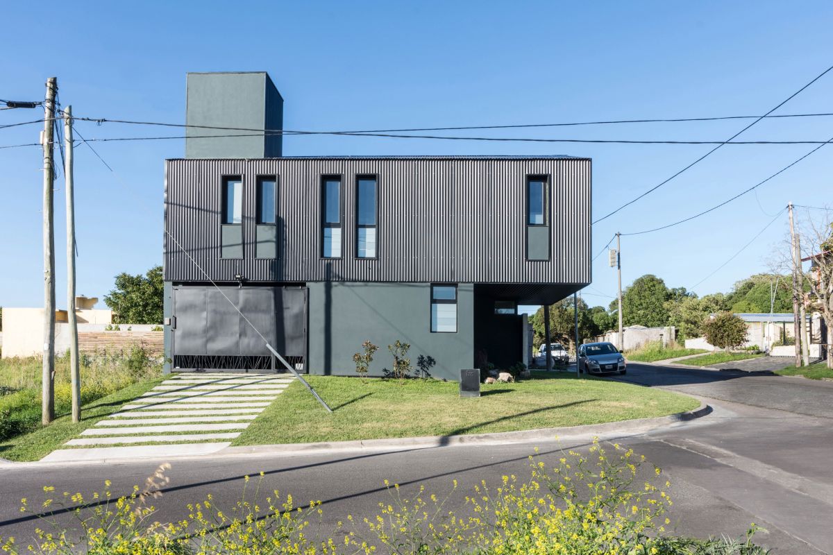 En la planta alta se disponen las áreas públicas de la casa. Un volumen liviano, revestido íntegramente en chapa, contiene la cocina y el estar comedor. El prisma emerge sobre la línea municipal, generando un semicubierto sobre ella y a su vez se perfora, desmaterializando su límite, buscando dialogar a partir de las visuales entre la casa y la calle.