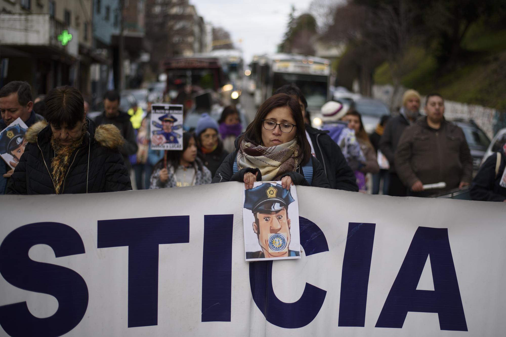 Uno de los carteles que portaban los familiares y amigos decía “Lucas Muñoz, secuestrado y ejecutado en democracia”. Los padres del joven policía también participaron con una bandera con pedidos de justicia.