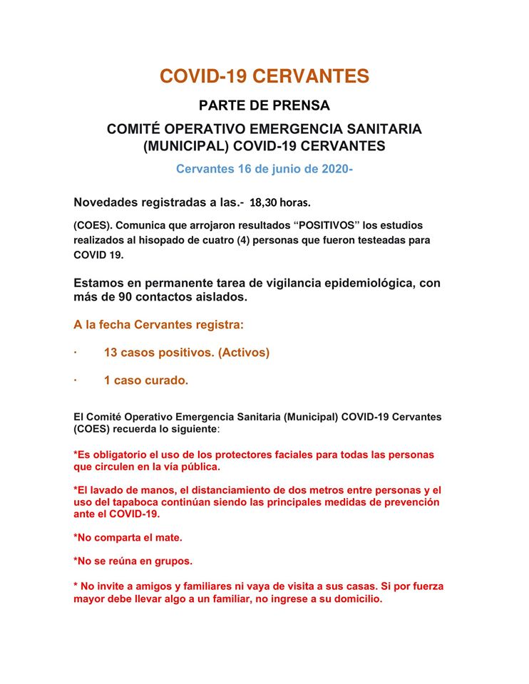 A la fecha Cervantes registra 13 casos positivos activos y un paciente curado.