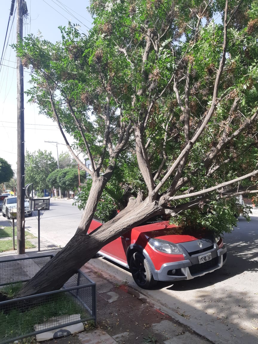 El viento trajo otras complicaciones, como caídas de postes y voladuras de tejas. El hecho fue en el barrio Arévalo, y el dueño del rodado acababa de estacionar. Cuando salió, se encontró con una desoladora imagen.