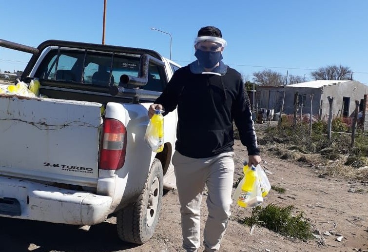 En esta oportunidad, el gobierno de Viedma junto a promotores del ministerio de Desarrollo Social de la Nación, entregaron kits de lavandina, jabón y alcohol en gel a las familias del barrio Unión.