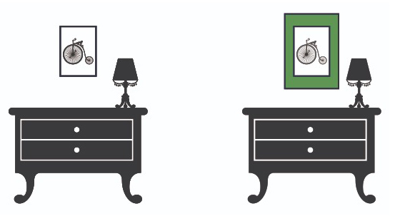 Otro aspecto a tener en cuenta es que el tamaño de la lámina no tiene por qué ser el tamaño del cuadro. En ocasiones es una imagen atractiva, pero al ser pequeña se pierde en la pared. La solución es conseguir un marco de mayores proporciones y agregarle passe-par-tout (papel de color entre el marco y la obra) para que tenga mayor presencia.