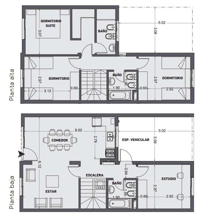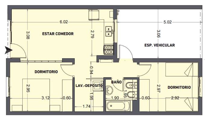 Las unidades cuentan con living comedor integrado, dos dormitorios, baño y lavadero, y tienen la posibilidad de ser ampliadas con una planta alta que lleva el volumen habitable a 116 m2 cubiertos, ya con 3 dormitorios, 3 baños, un amplio living comedor y estudio. Esta ampliación debe realizarse respetando el manual del usuario para que el diseño de la planta baja pueda soportar las cargas de manera eficiente. Por caso, debe realizarse con el sistema constructivo seco, y con perfilería de madera o aluminio.