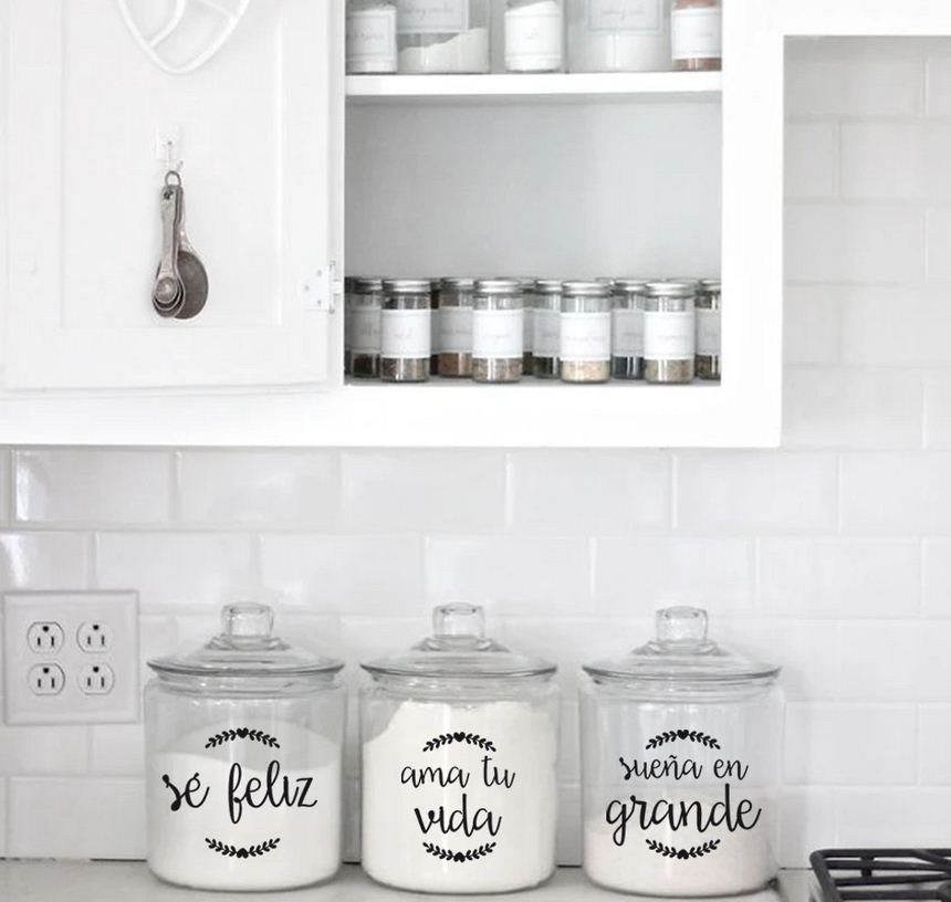Los frascos o contenedores son un elemento distintivo de la cocina. Suelen colocarse todo tipo de especias como semillas, y si son de tamaño más grande se pueden colocar también cereales, pastas o harina. Es ideal que estén al alcance de la mano y rotulados o etiquetados adecuadamente. Esto, a la hora de cocinar, simplificará el proceso y evitará pérdidas de tiempo buscando un producto que quedó escondido o tapado por otro producto en un cajón del bajo mesada.