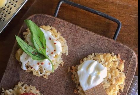 Hervir y colar el arroz, precalentar horno a temperatura media. Aceitar una placa y disponer con una cuchara la mezcla haciendo círculos compactos, aplastados. Llevar al horno 15 minutos, retirar y colocarle arriba lo que prefieras.