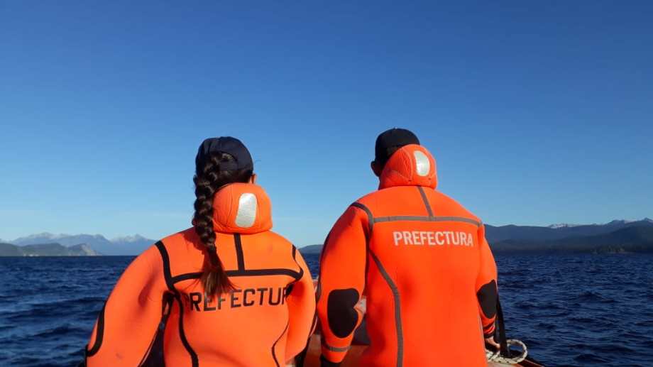Tres embarcaciones de Prefectura recorrer el lago desde las 6.30 y a media mañana, se suma el helicóptero del Sistema Federal de Manejo del Fuego. Las condiciones meteorológicas son mejores que ayer.
