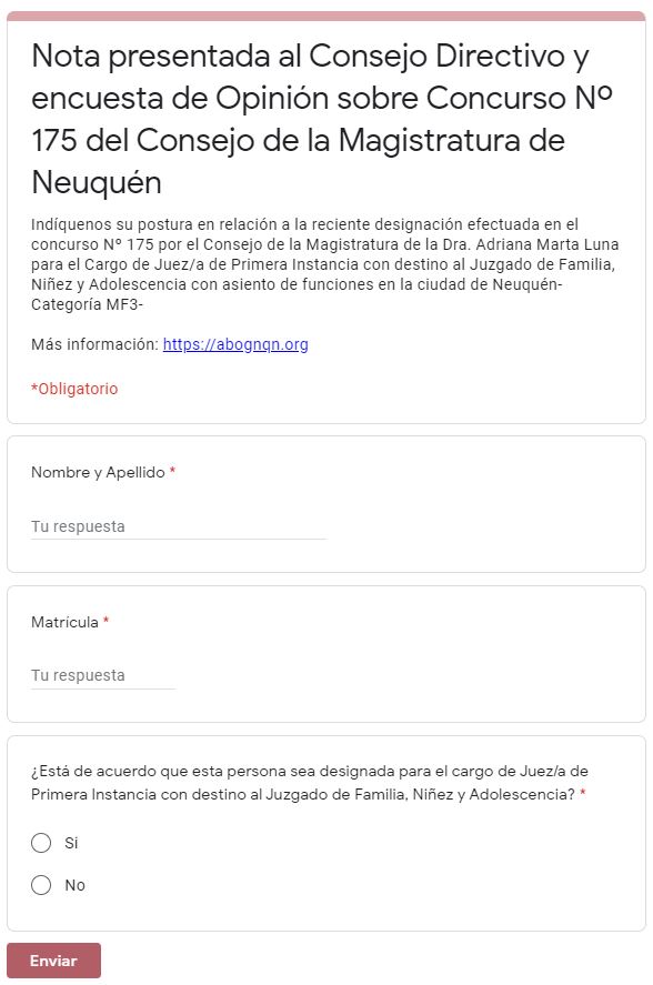 «Indíquenos su postura en relación a la reciente designación efectuada en el concurso Nº 175 por el Consejo de la Magistratura de la Dra. Adriana Marta Luna para el Cargo de Juez/a de Primera Instancia con destino al Juzgado de Familia, Niñez y Adolescencia con asiento de funciones en la ciudad de Neuquén- Categoría MF3», dice el enunciado de la encuesta.