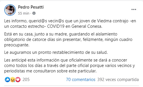 «Les informo, querid@s vecin@s que un joven de Viedma contrajo -en un contacto estrecho- COVID19 en General Conesa», afirmó el jefe comunal que se anticipó al parte de prensa de la Provincia de Río Negro.
