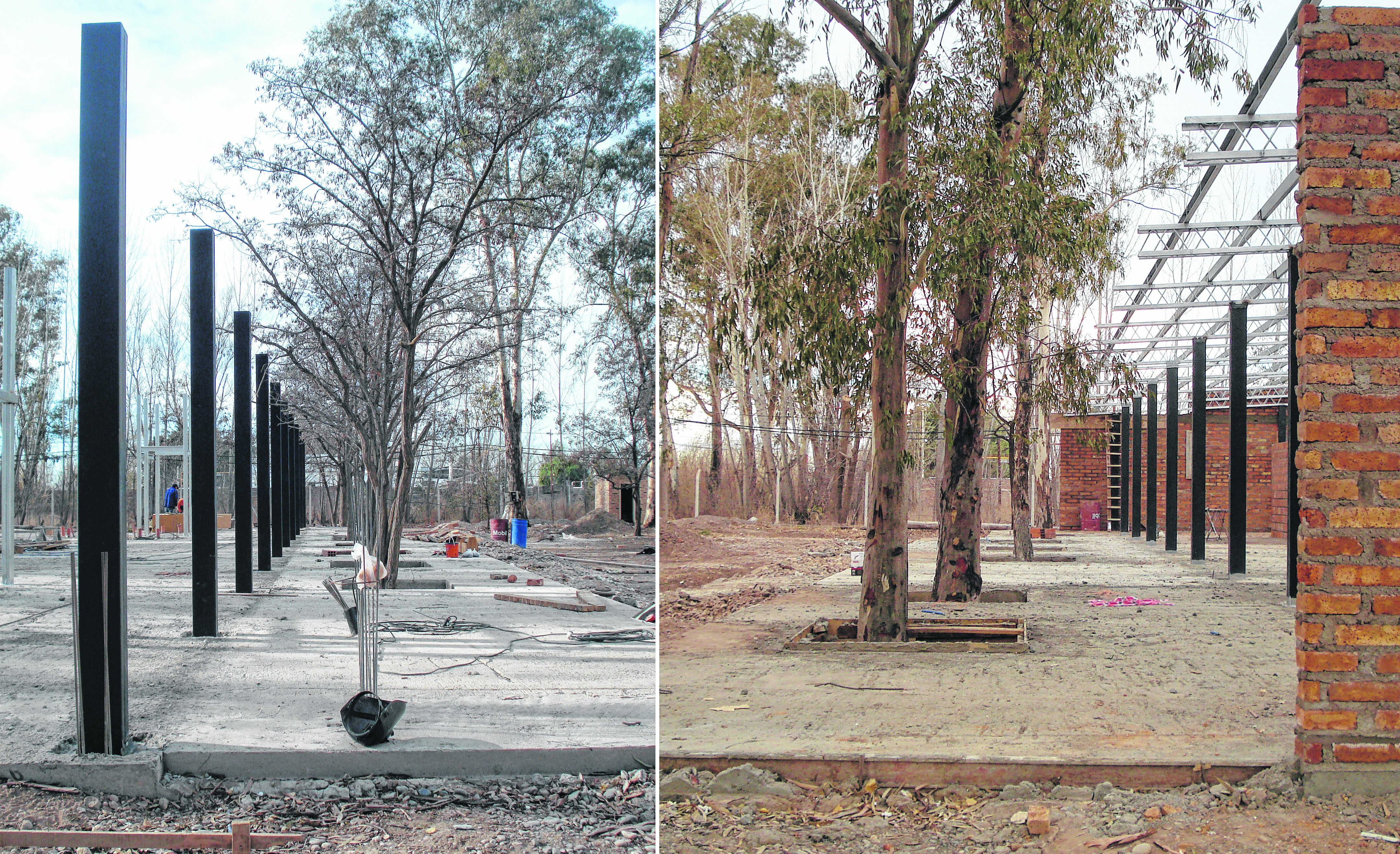 El proyecto contempla, en su génesis, los árboles existentes inmediatos para lo cual se diseña una placa que aloja los ejemplares y donde se apoyan finalmente las oficinas.
