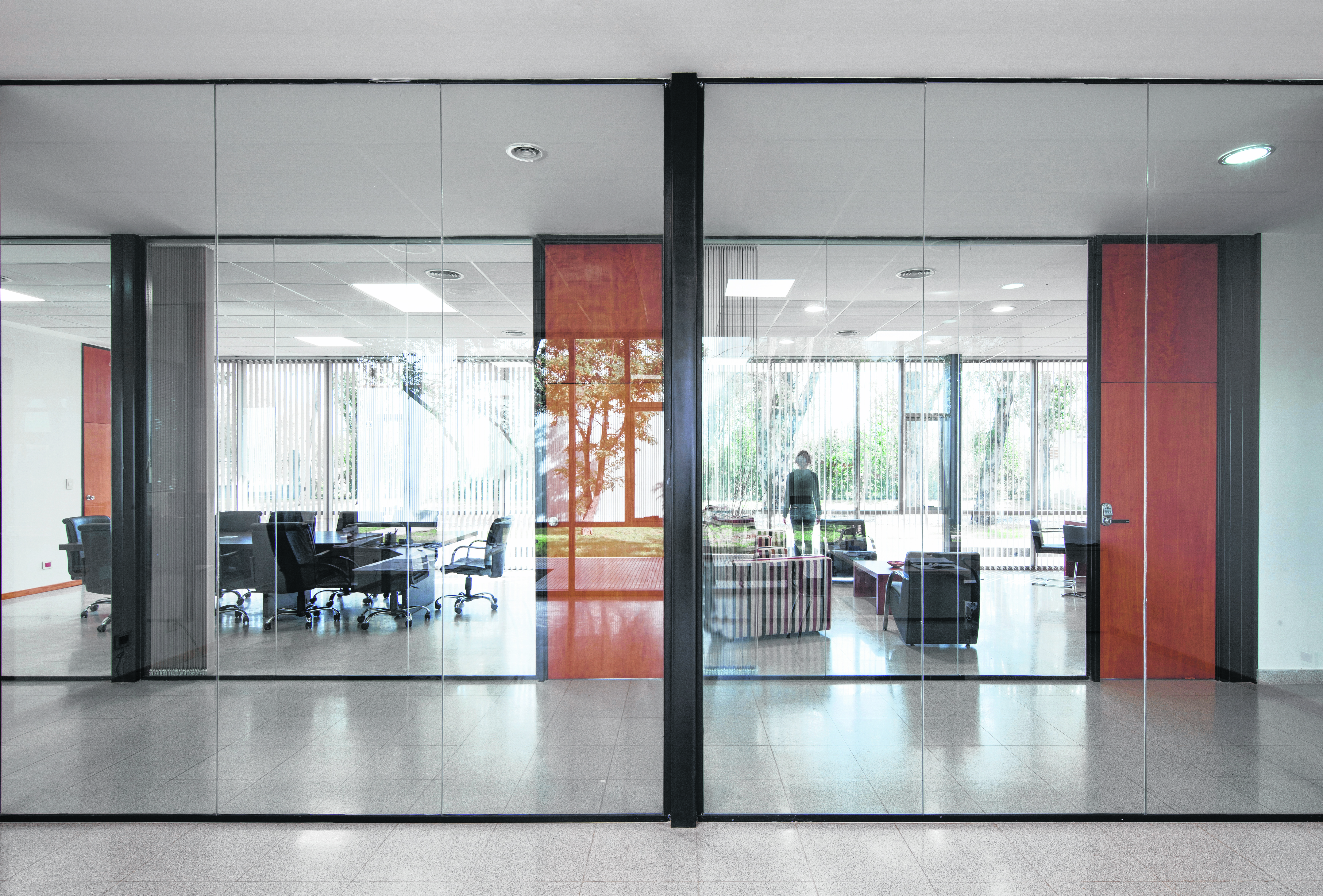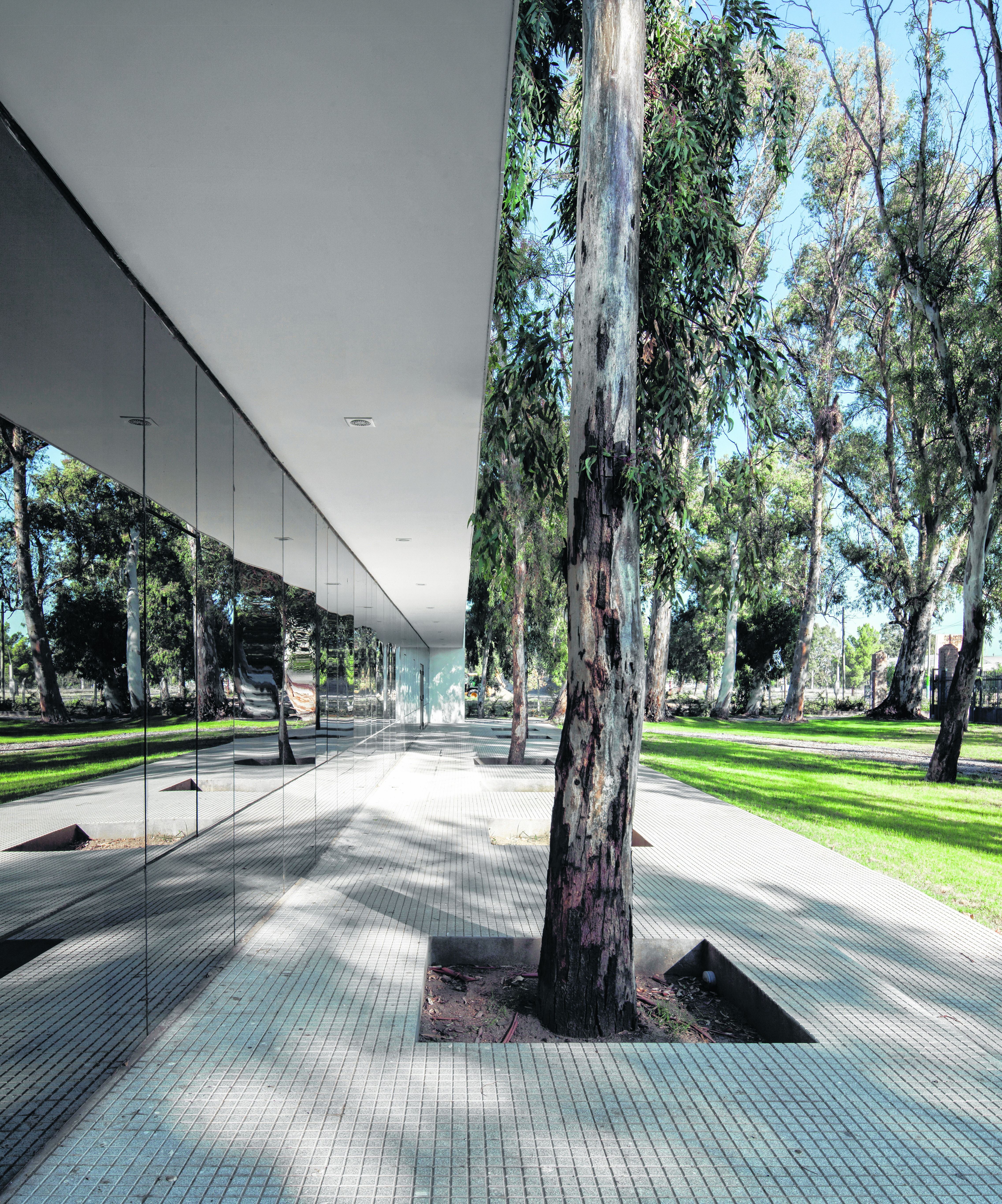 Esta relación se materializa con vidrios traslúcidos en el interior lo que permite la continuidad visual y con vidrios semiespejados en el exterior, efecto multiplicador de la naturaleza exterior y condición de mimesis.
