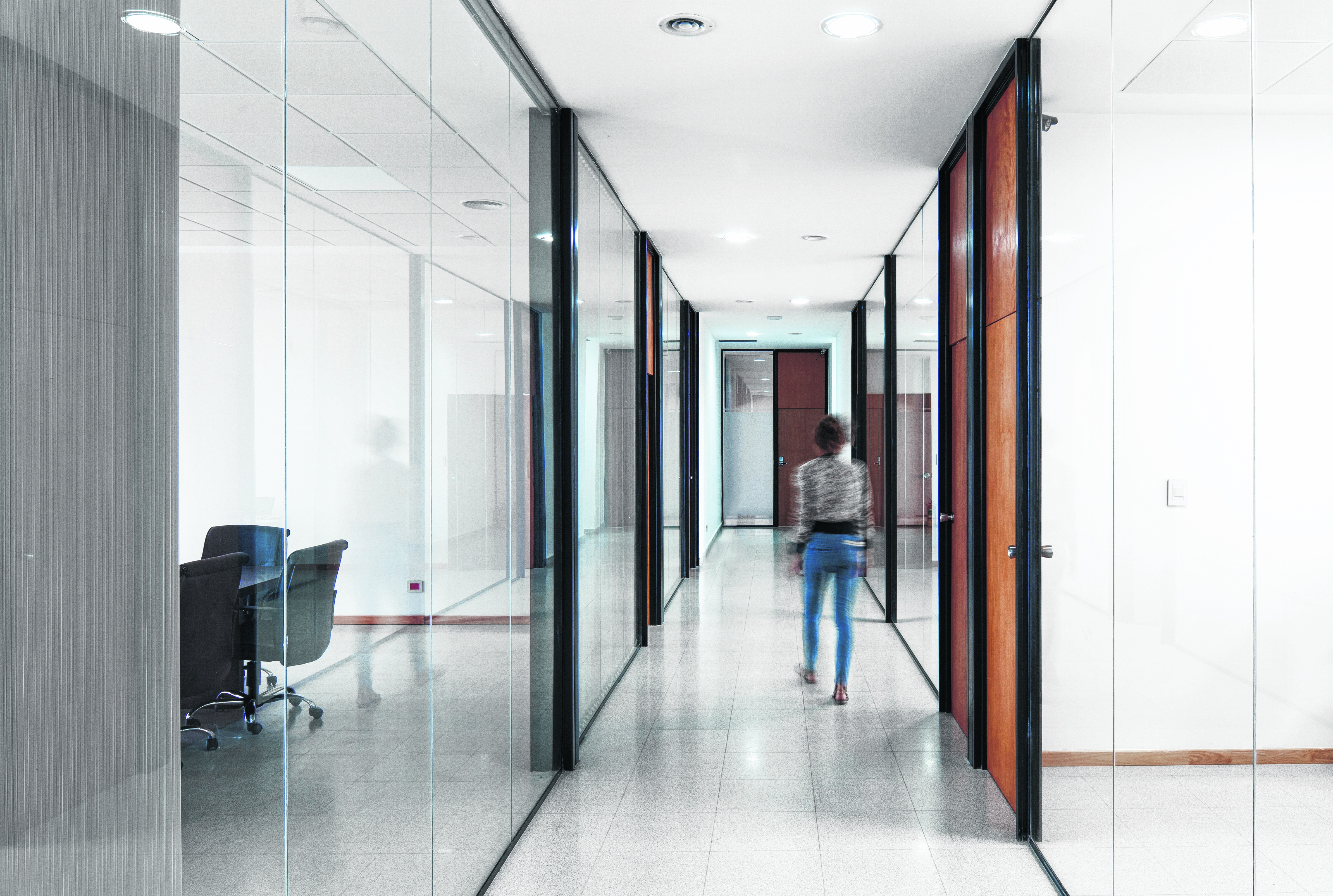 Las divisiones se materializan con tabiquería de placas de yeso las que pueden quitarse o sumarse en función a la necesidad. Estas solo aparecen en sentido longitudinal evitando cortar la relación visual con el exterior en el sentido norte-sur.