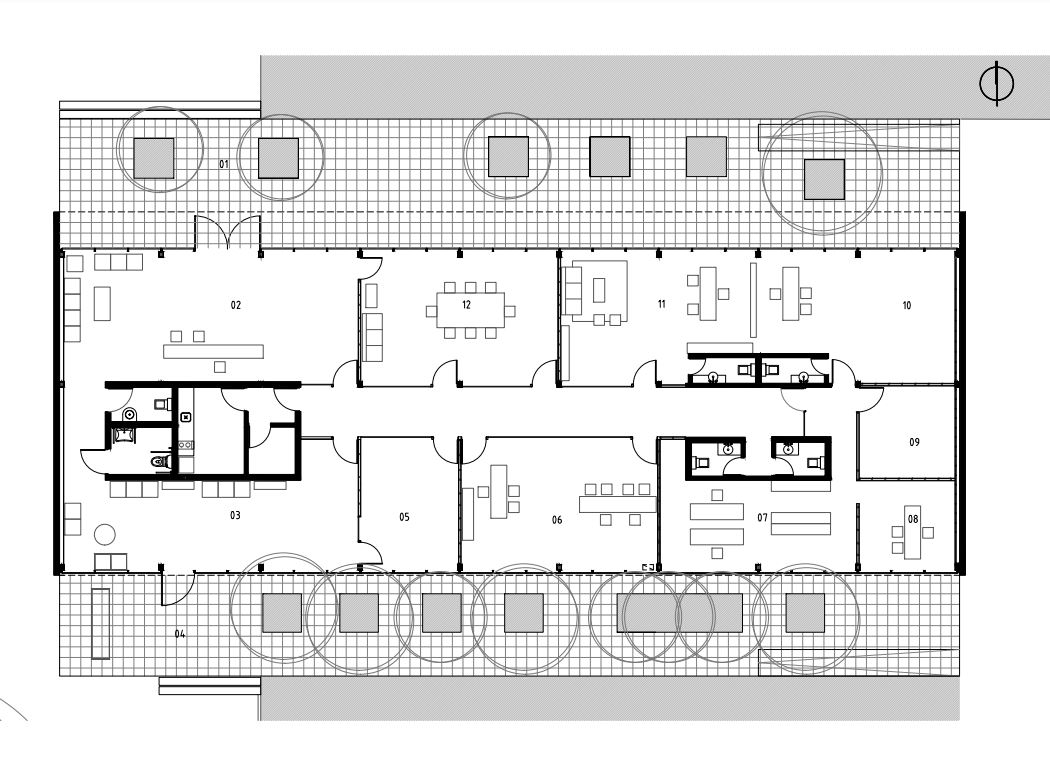 A partir de dos núcleos húmedos se articula la planta: área de trabajo y área de recepción. La zona de circulación interna se define como un espacio más dentro del proyecto intentando desdibujar la idea de “pasillo”. La relación visual fluida entre los diferentes ámbitos de trabajo, a través de esta ultima, puede ser modificada por medio de dispositivos móviles, cortinas.