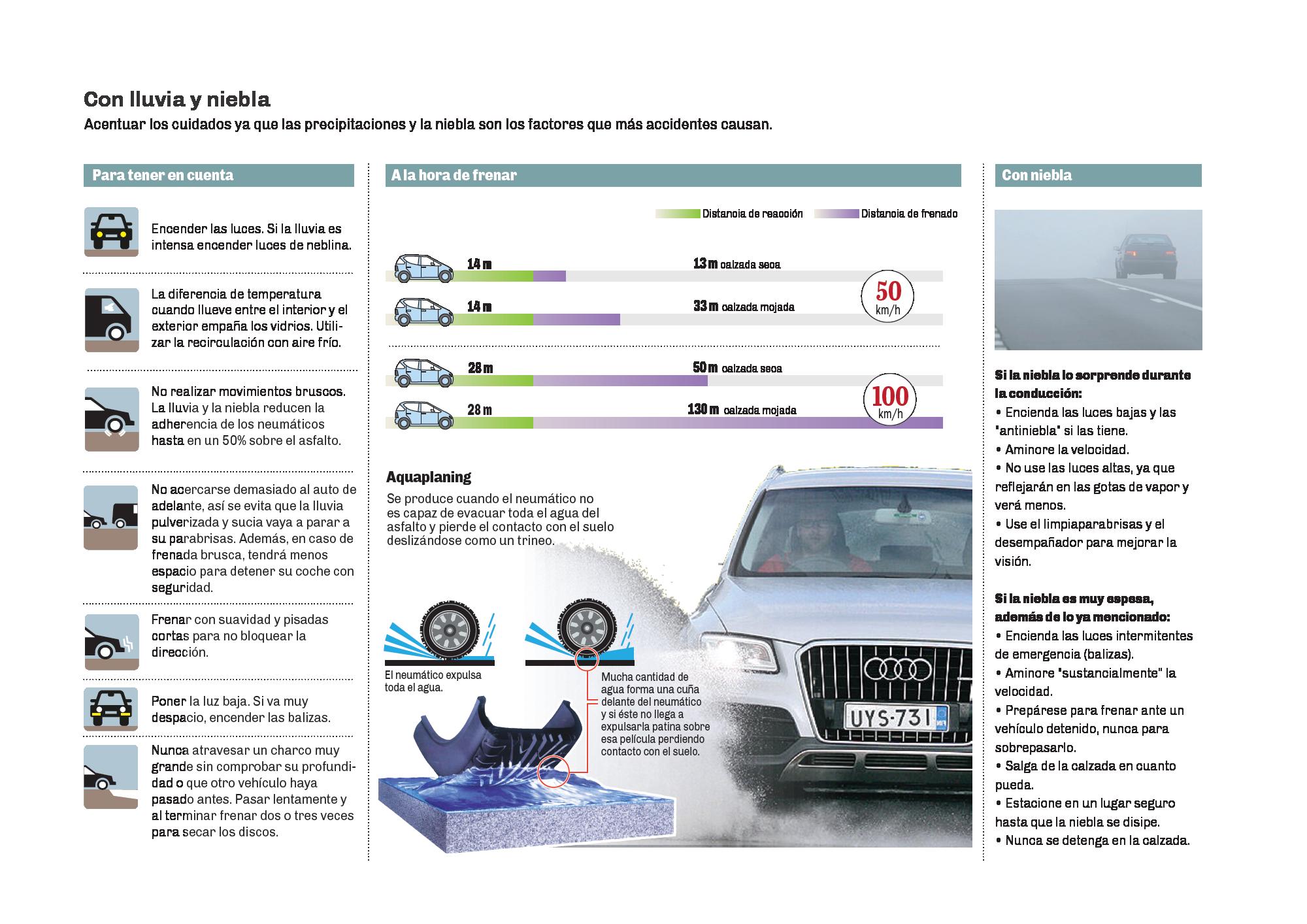 Con la lluvia, la visibilidad se reduce notablemente y los frenos se mojan, lo que hace que aumenten significativamente las distancias de frenado, llegando incluso a duplicarse.