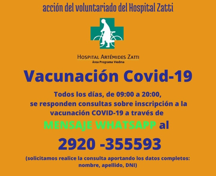 Por otra parte, aquellas personas de nuestra comunidad que quieran obtener información sobre su inscripción al sistema de vacunación covid 19, pueden enviar un mensaje Whatsapp al 2920-355593. El grupo de voluntarios del hospital Zatti responderá los mensajes todos los días de 9 a 20. En el mensaje de consulta los interesados deben escribir el nombre, apellido y DNI.