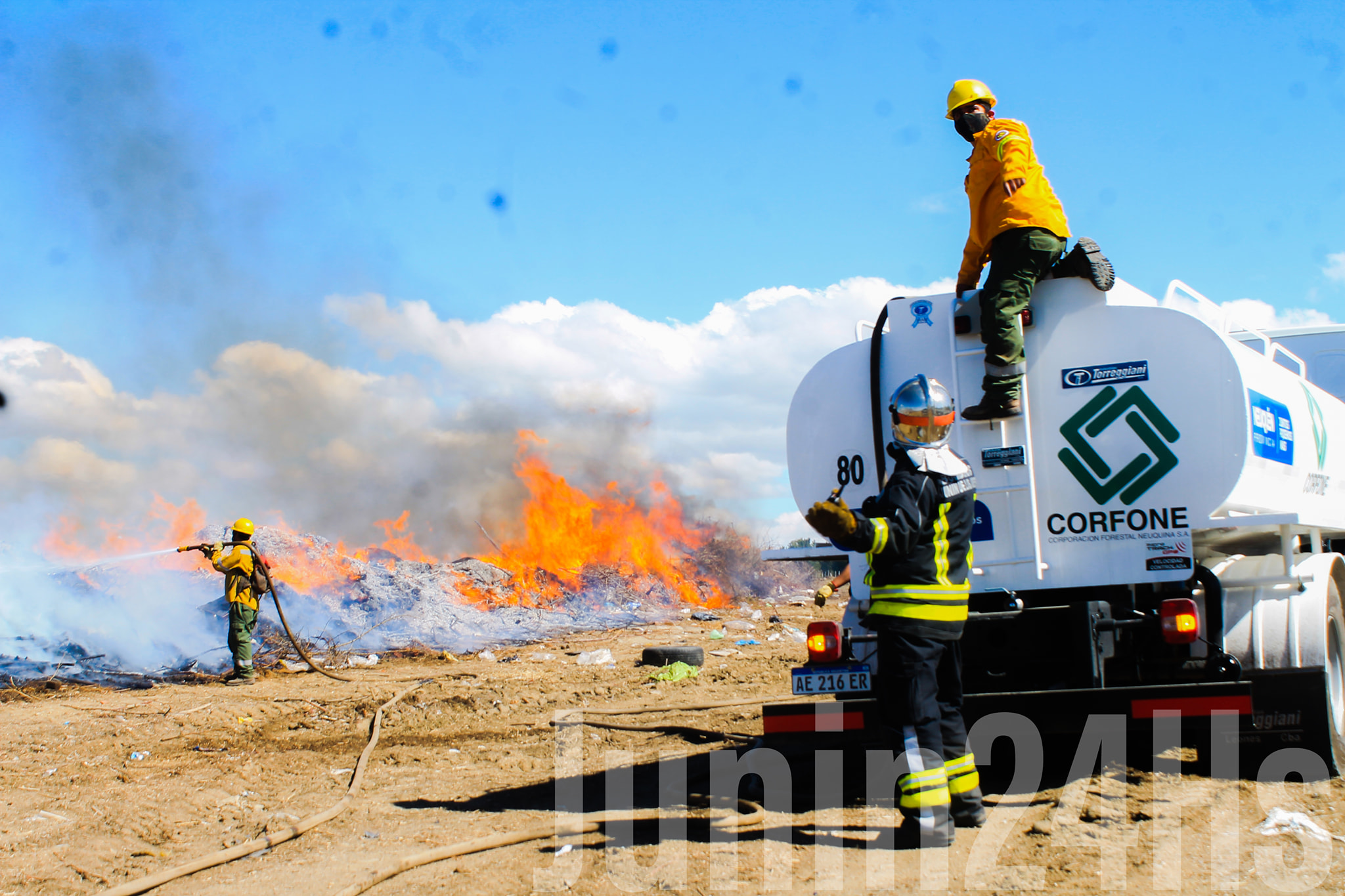 Ayer se desató un incendio en la planta de tratamiento de residuos de Junín de los Andes. El fuerte viento, con ráfagas que alcanzaron los 69 kilómetros por hora, dificultó las tareas de los Bomberos Voluntarios. Debieron actuar con celeridad para que el fuego no avanzara hacia la zona de viviendas del Regimiento, a un kilómetro del lugar donde comenzó el fuego. El siniestro ya está controlado, pero todavía «no está extinguido», pues queda apagar algunos puntos calientes.