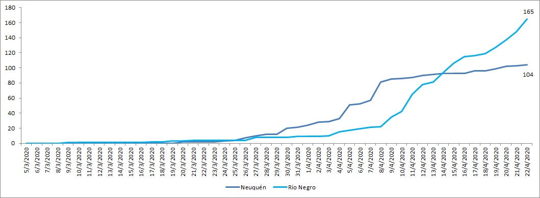 En síntesis, Neuquén tiende significativamente a aplanar la curva. Río Negro muestra cierto descontrol de casos, al punto de llamar la atención a los epidemiólogos y autoridades de Nación. Desde el gobierno central se sigue atentamente la evolución rionegrina, con guarismos que han desplazado en parte el foco puesto casi exclusivamente en Chaco, respecto de los territorios fuera de Buenos Aires.