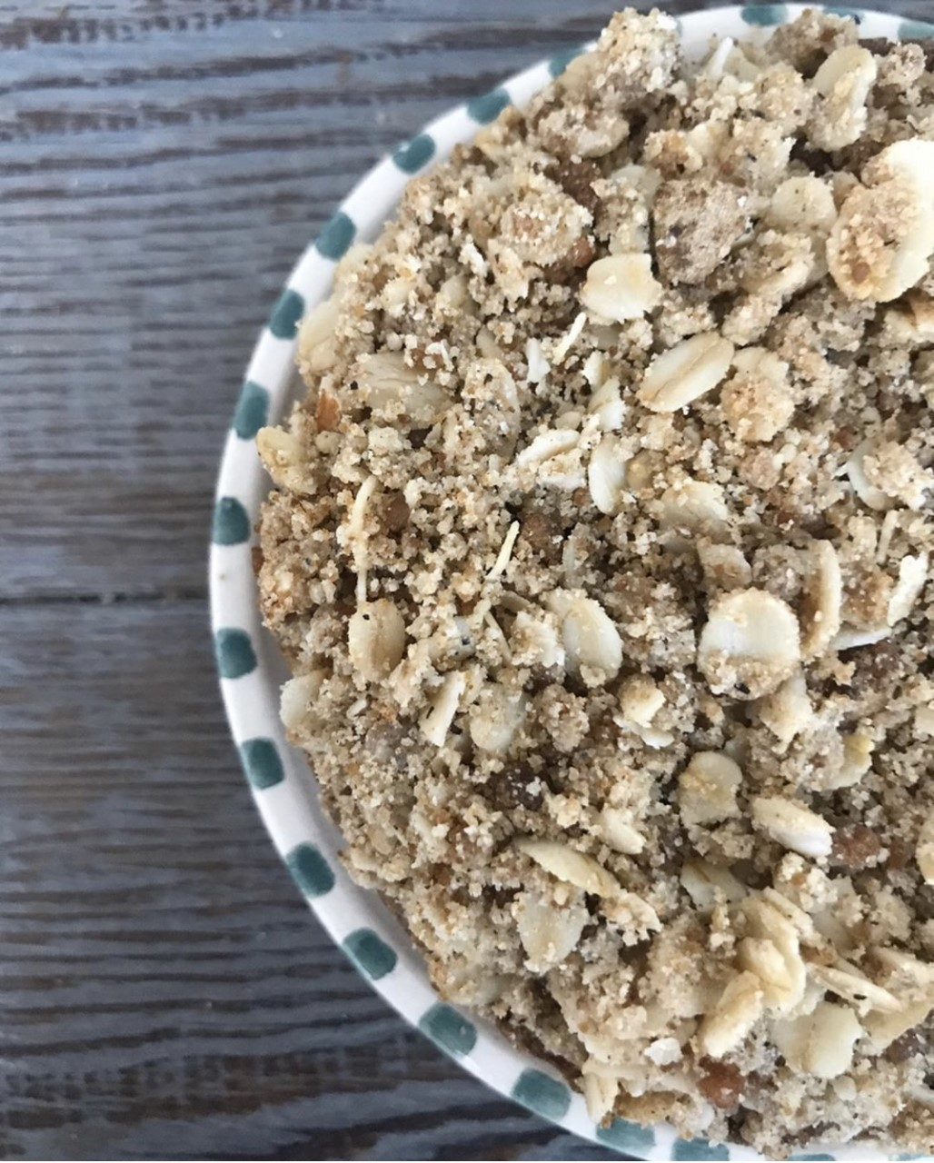 4- En otro bol con tus manos armá un arenado con 2 cucharadas de harina integral, 2 de azúcar mascabo, 2 de avena, 5 almendras en trocitos, 1 cucharada de aceite de coco y 1 pizca de sal.