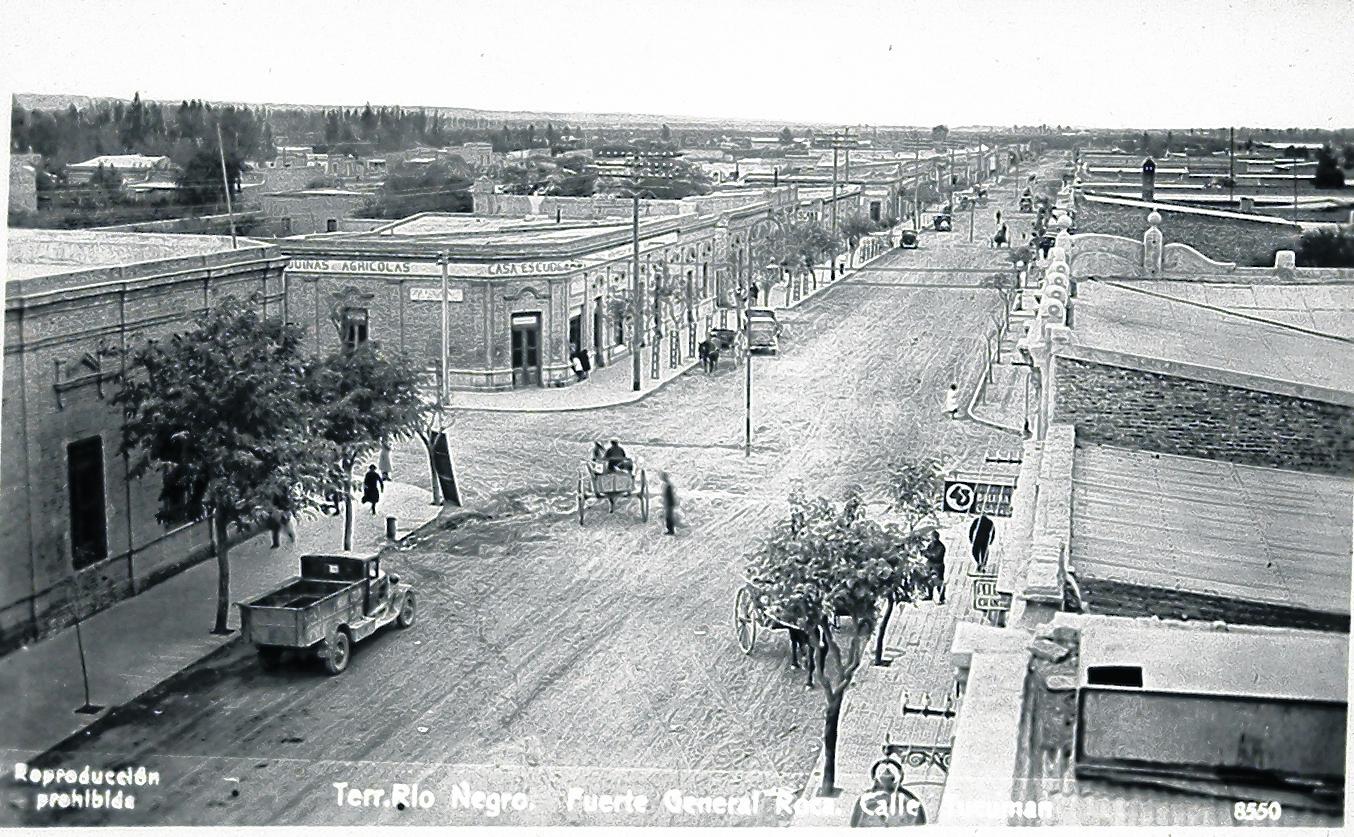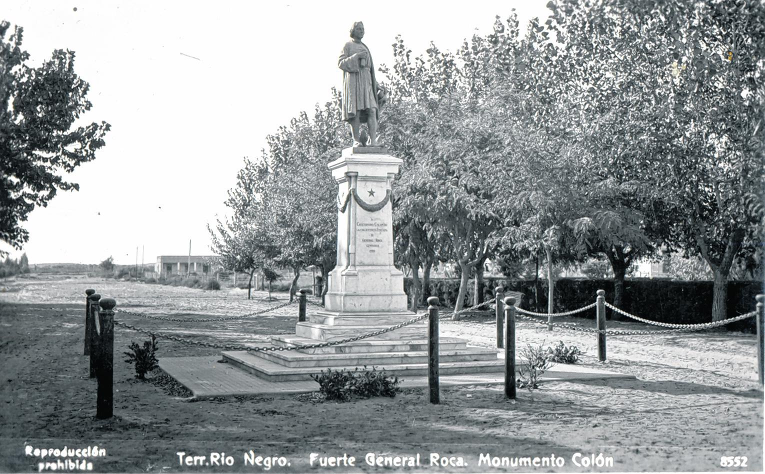 Monumento a Colón en Av. Roca, entre Mitre y San Martín (circa 1940). Donado por la comunidad italiana al pueblo de General Roca en 1928. Se puede observar como las plazas San Martín y Belgrano estaban rodeadas por un cerco de ligustrinas. En el año 1971 fue trasladado a su actual emplazamiento en la Plaza de las Naciones de Av. Roca y Uruguay.
