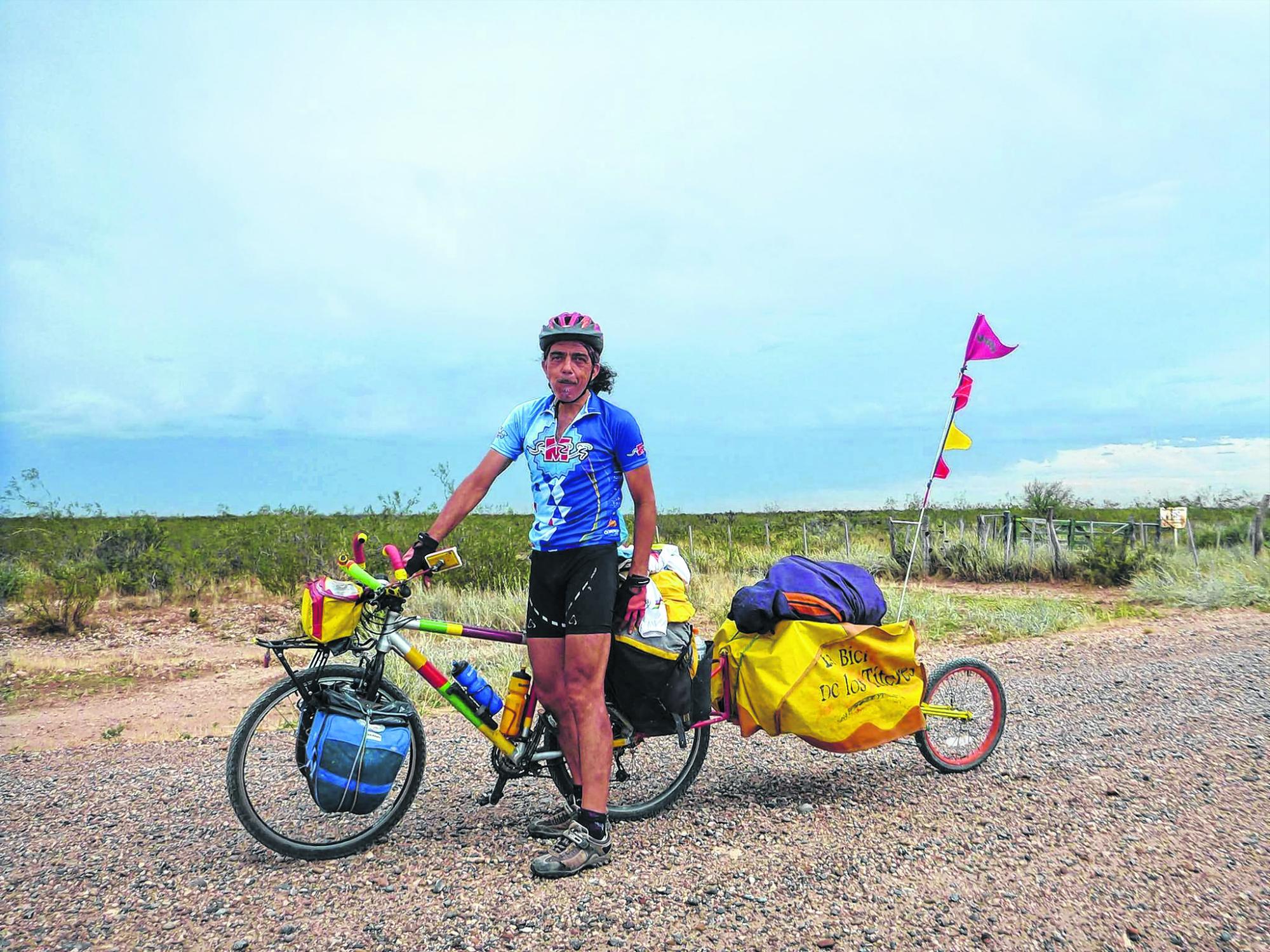 Hace doce mil kilómetros que forman un solo equipo con su bicicleta. Durante los viajes sus marionetas descansan en el fondo de una valija y es “la andariega” manejada por las manos y potenciada por sus piernas la que se transforma en la protagonista sobre el inmenso escenario de la naturaleza. “Viajar en bicicleta es como ser parte del paisaje, los animales no escapan porque no sienten ruido de motor, las mariposas, que las hay por millones, te acompañan, los pájaros se pueden ver y sobre todo escuchar. Viajando en bici uno se da cuenta de la inmensa cantidad de cosas que no se ven cuando se lo hace en un auto u otro vehículo”.