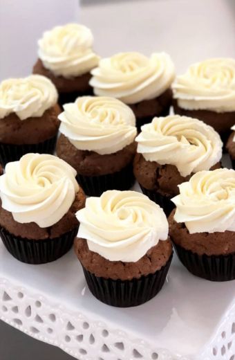 Enfriar estos cupcakes se decoran con crema de queso, que se realiza batiendo 200 g de queso crema con 150 g de crema de leche, unas gotas de esencia de vainilla y 2 cucharadas de azúcar impalpable. Batir todo hasta punto chantilly y decorar con maga ó espatula. Si no tenés queso crema podés decorarlo con crema sola. ¡¡Quedan riquísimos!! Si se quiere pasar los bordes por nueces picadas. Guardar en la heladera.