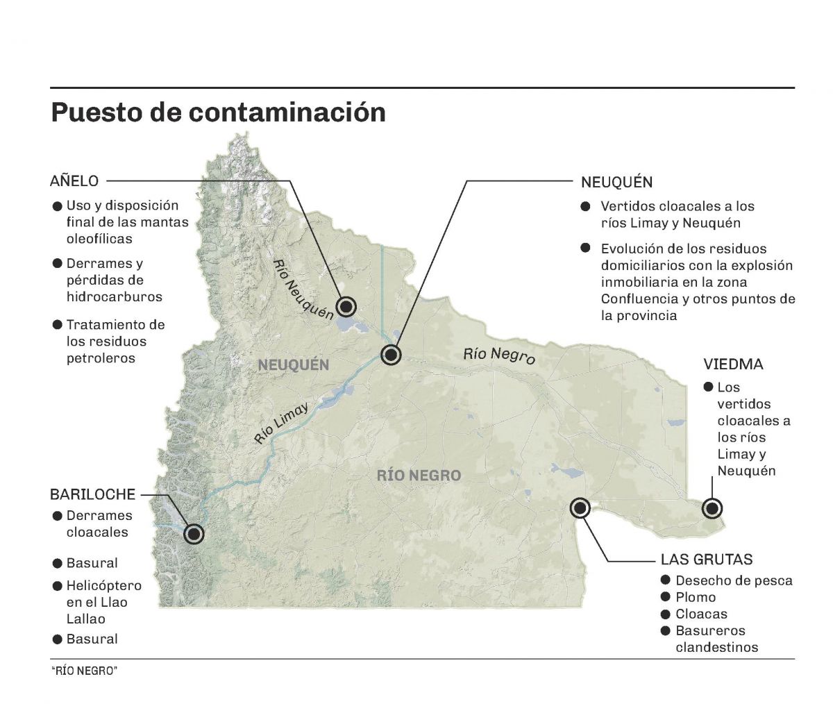 1) Los vertidos cloacales a los ríos Limay y Neuquén; 2) La evolución de los residuos domiciliarios con la explosión inmobiliaria en la zona Confluencia y otros puntos de la provincia y; 3) La industria petrolera, que tiene, a su vez, tres puntos a considerar: a) El uso y la disposición final de las mantas oleofílicas; b) Los derrames y pérdidas de hidrocarburos y; c) El tratamiento de los residuos petroleros.