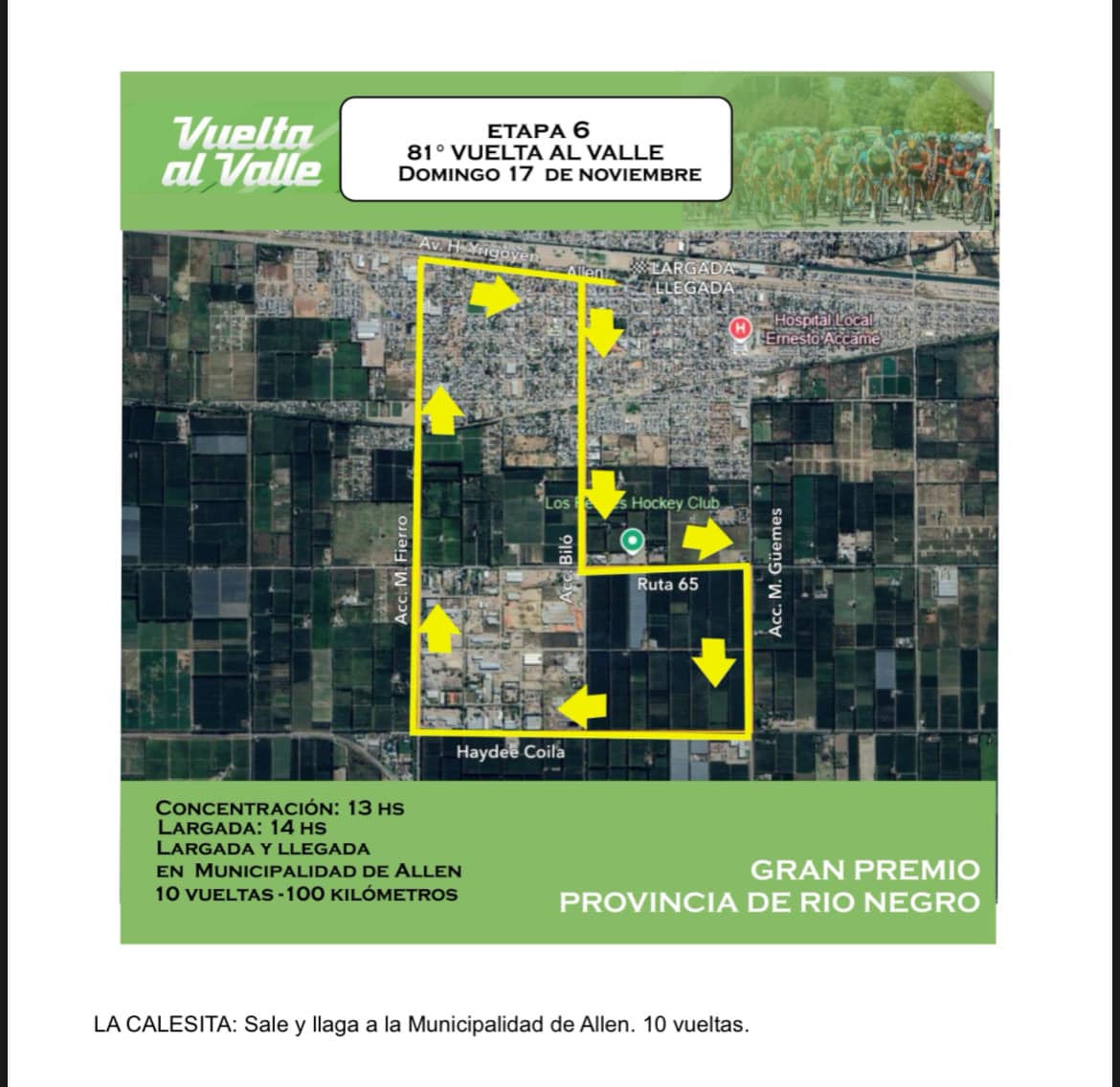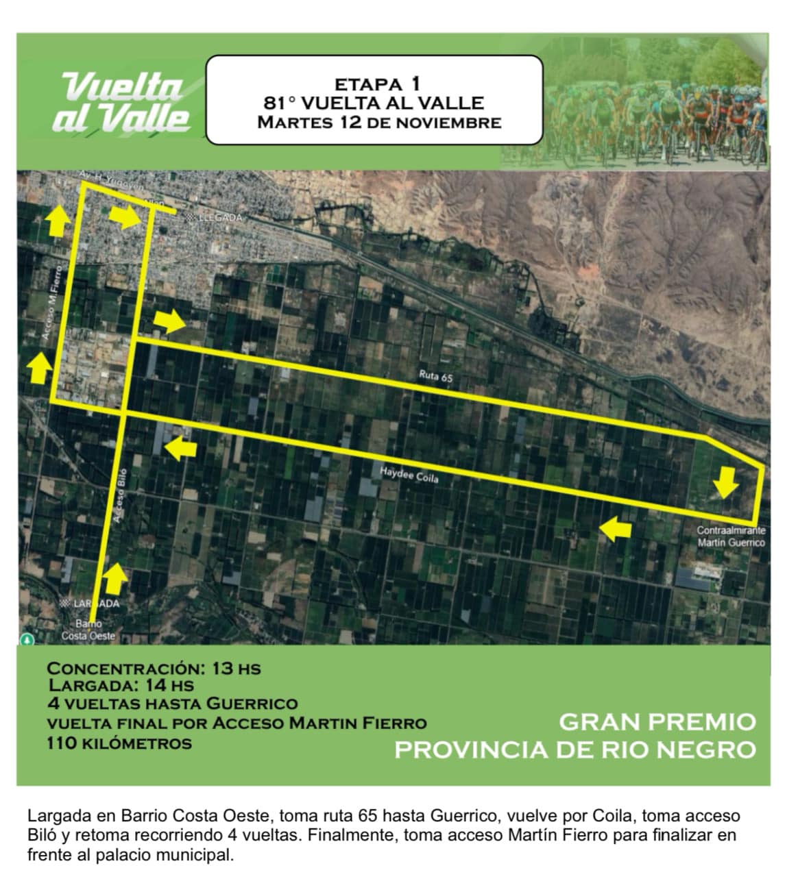 La primera etapa de la competencia es el martes. Irá de Allen hasta Guerrico, con largada en el barrio Costa Oeste y llegada en la Municipalidad. Pasará por la Ruta 65 y por la calle Rural Haydeé Coila.
