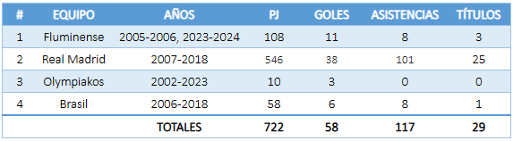 Con 25 títulos en Real Madrid, entre ellos cinco Champions, seis Ligas y cuatro Mundiales de Clubes, el lateral que cumplirá 37 en mayo pasó 16 temporadas en el Merengue, donde arribó con solo 18 años en enero de 2007, llegó a ser capitán y se volvió una leyenda tras 546 partidos y 38 goles.
