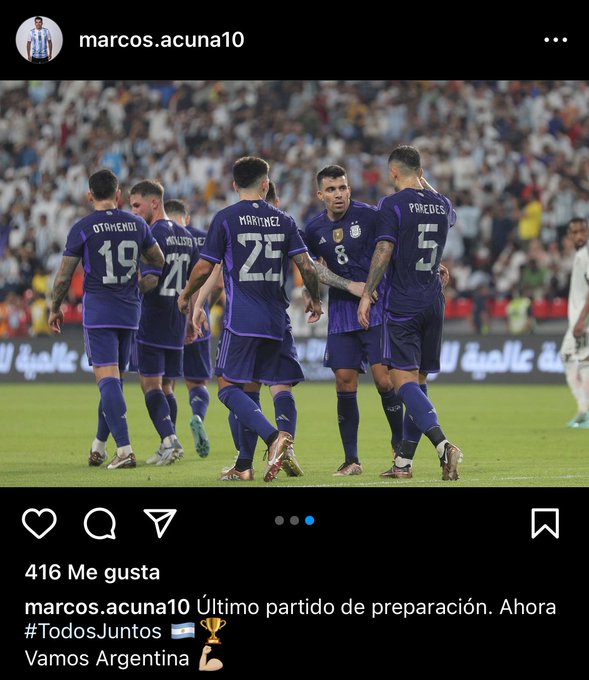 El entrenador argentino también quiso saber cómo estaba Marcos Acuña de la rebelde pubalgia que lo aquejaba. El lateral zapalino respondió en gran forma, siendo salida permanente por la izquierda de la defensa. Confirmada su aptitud, el Huevo salió del campo en el entretiempo. Misión cumplida aunque desde Doha, hubo versiones que Acuña podría volver a ser observado por el cuerpo médico albiceleste, tras los dichos de Scaloni sobre los lesionados y la lista de los 26.