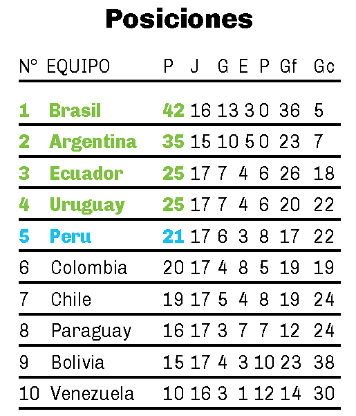 En Barranquilla, Colombia (20 puntos) hizo su parte ante Bolivia, lo venció 3-0 y sigue con aspiraciones de llegar al Repechaje. Para lograrlo, debe vencer a Venezuela como visitante y esperar que Perú (21) no le gane a Paraguay en Lima. Chile, el otro con chances aunque remotas, quedó con 19 unidades.