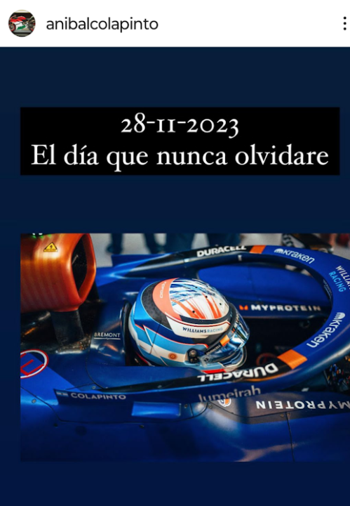 El 28 de noviembre del año pasado: “El día que nunca olvidaré”. Eso fue lo que posteó Aníbal en sus redes sociales junto a una imagen de Franco subido a un Williams en una prueba libre disputada en Abu Dhabi, en lo que fue el primer contacto del joven piloto de Pilar con un Fórmula 1.