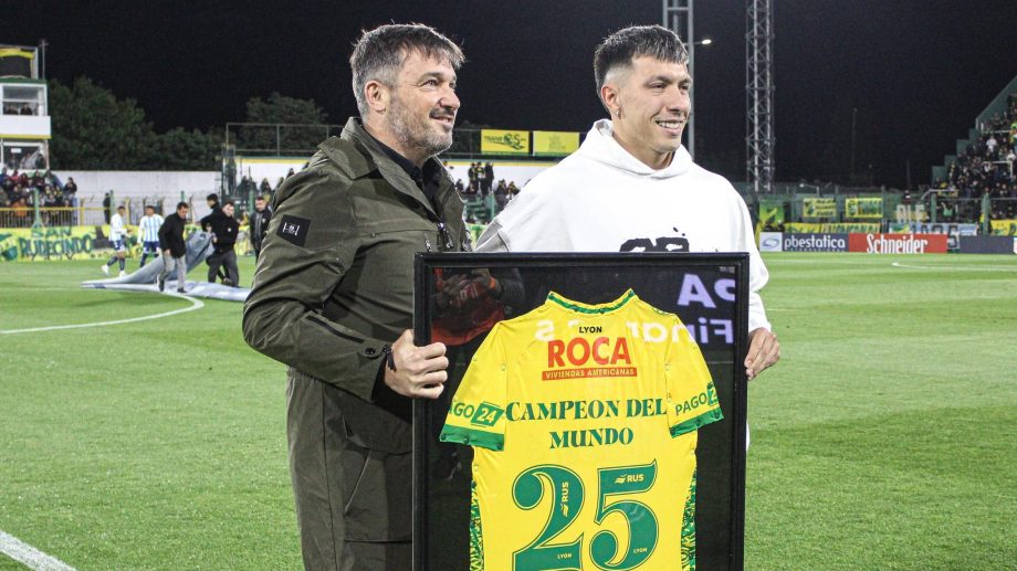 En la previa al encuentro que tuvo como protagonistas a Defensa y Justicia y Racing, desde la institución le hicieron entrega a Lisandro Martínez de una camiseta del Halcón que en la espalda tenia escrito «campeón del mundo».