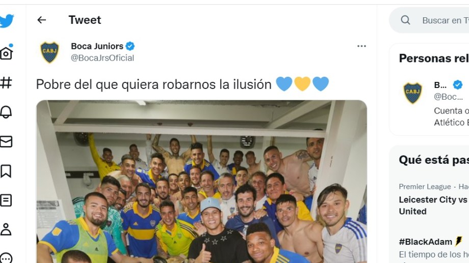 Ese mensaje fue visto por la gente que maneja las redes de Boca, ya que la foto de los festejos en el vestuario del triunfo sobre Gimnasia tuvo como epígrafe la misma frase que había usado la cuenta de Racing.
