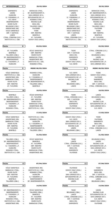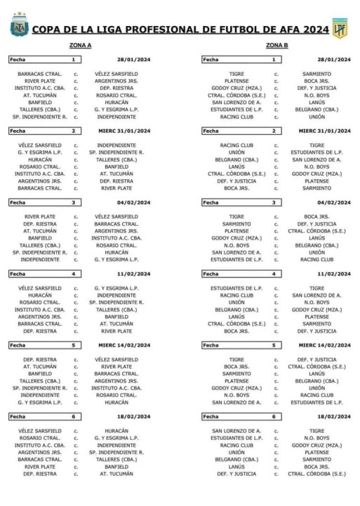 Este martes se conoció el fixture de la Copa de la Liga Profesional de 2024, que estará dividida en dos zonas de 14 equipos cada una. El inicio de la competencia está programado para el fin de semana del 27 y 28 de enero. En tanto que los partidos interzonales se disputarán el último fin de semana de febrero, cuando se juegue la séptima fecha.