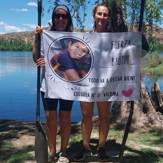 Son dos palistas viedmenses que tomaron parte de la travesía para visibilizar el pedido de ayuda de Bauti, un chiquito que debe hacerse un costoso tratamiento para tratar su enfermedad.