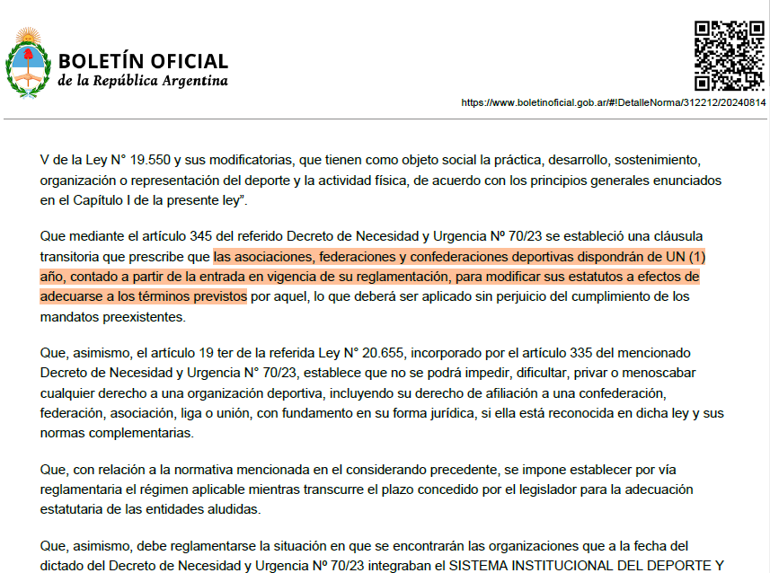 “Mediante el artículo 345 del referido Decreto de Necesidad y Urgencia Nº 70/23 se estableció una cláusula transitoria que prescribe que las asociaciones, federaciones y confederaciones deportivas dispondrán de UN (1) año, contado a partir de la entrada en vigencia de su reglamentación, para modificar sus estatutos a efectos de adecuarse a los términos previstos por aquel…”, reza el comunicado emitido por el Boletín Oficial a través del Poder Ejecutivo sobre el decreto 370/24, con fecha del pasado 13 de agosto.