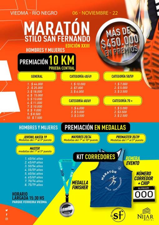 La Maratón Stilo-San Fernando se llevará adelante en las inmediaciones del Parque Intendente Jorge Ferreira, iniciando a las 11:30 y tendrá un circuito callejero con línea de partida, dividida por categorías y punto de partida a metros de la sede del Círculo de Atletas Veteranos de la Comarca (CAVECO) de Viedma.