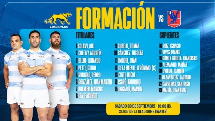 La selección Argentina, dirigida por el australiano Michael Cheika, formarán con Joel Sclavi, Agustín Creevy y Bello; Petti y Pedro Rubiolo; JM González, Kremer y Facundo Isa; Tomás Cubelli y Nicolás Sánchez; Juan Imhoff, Jerónimo De la Fuente (Capitán), Lucio Cinti y Rodrigo Isgró; Martín Bogado.