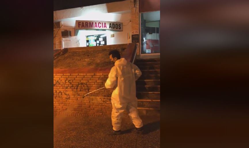 El funcionario llevó su pulverizador por todo el frente y los costados del ADOS, pero el trabajo en el interior no le corresponde. Ese es el centro del reclamo de los trabajadores, quienes denuncian que sus compañeros que habían tenido análisis no negativos dieron positivo luego de ir trabajar.