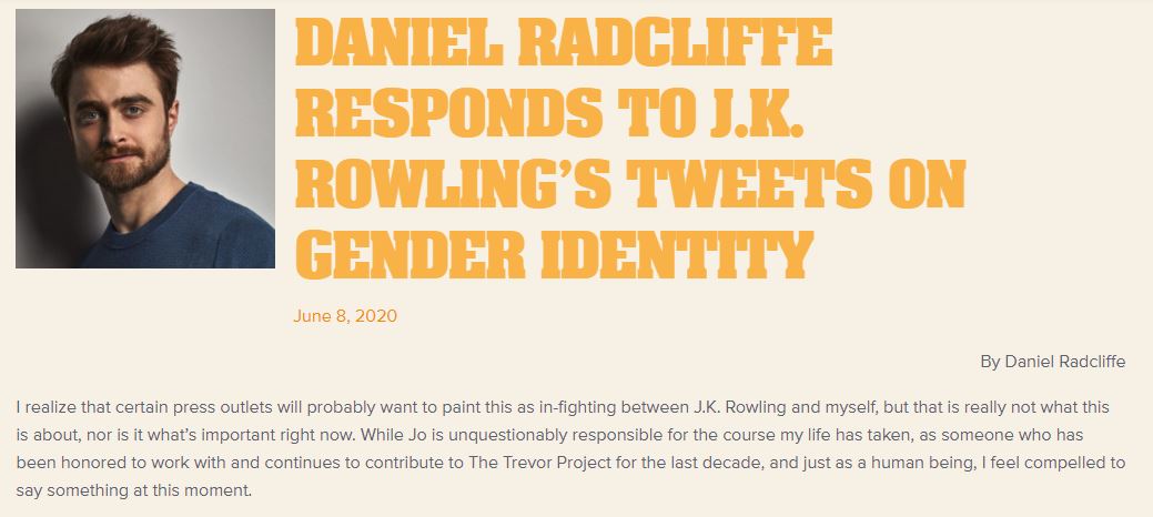 Esto generó tal revuelo que incluso los actores y actrices de la saga en cine la cuestionaron. Daniel Radcliffe (interpreta a Harry Potter) y Emma Watson (Hermione Granger) la contradijeron y mostraron su apoyo a la comunidad trans.