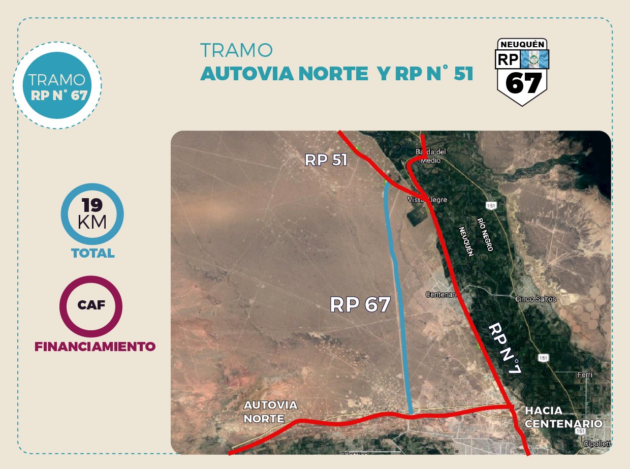 En la ruta provincial Nº 67 se prevé pavimentar 19 kilómetros, en el tramo que va desde el empalme con la Autovía Norte – en la salida de la actual Rotonda Pluspetrol- hasta la ruta provincial Nº 51. Esta obra tiene como objetivo principal descongestionar el tránsito de carga que actualmente circula por la ruta provincial N° 7, atravesando Neuquén, Centenario y Vista Alegre, sin necesidad de ingresar a los cascos urbanos de esas ciudades.