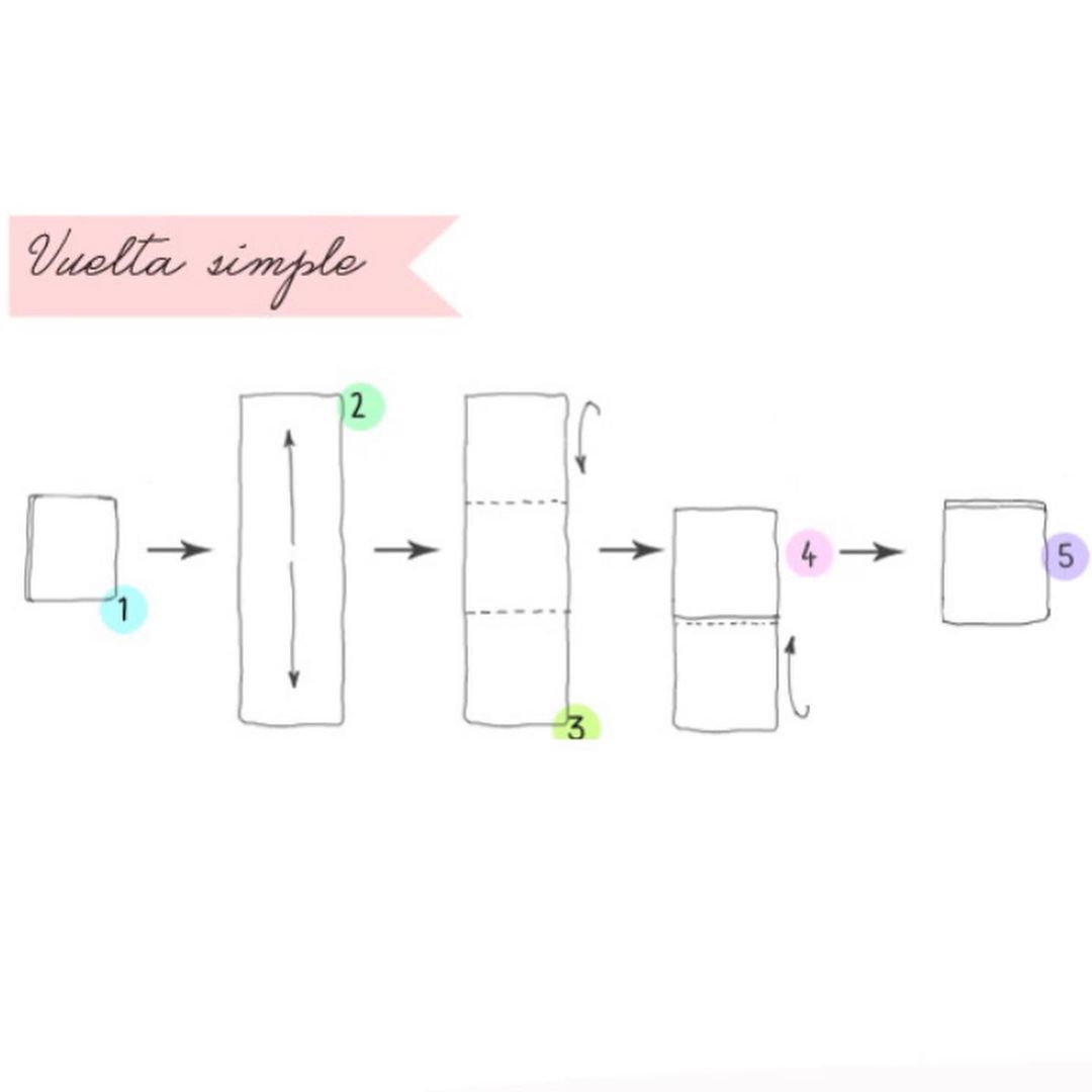 2. Estirá la masa de forma rectangular con palo de amasar, pincelala con aceite y espolvoreala con azúcar (presionando con los dedos para que se pegue bien). Ahora hacé los dobleces del hojaldre (dibujo). Repetí el paso 2.